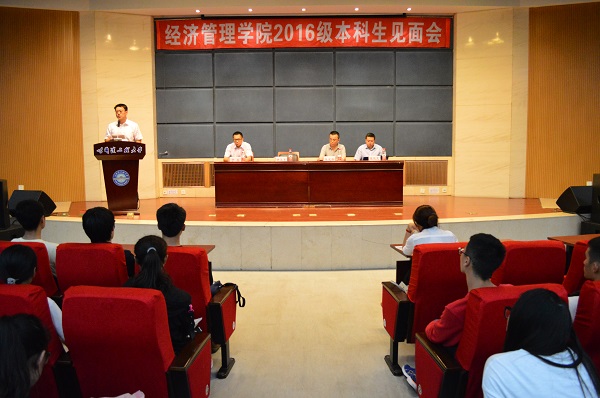 9月22日14时,经济管理学院于图书馆报告厅举行2016级本科生见面会。学院党委书记钟卫东、党委副书记于磊、副院长张俊龙、副院长朱建新出席会议,学生工作办公室主任韩微、2016级辅导员董治安及全体2016级本科生参加会议。