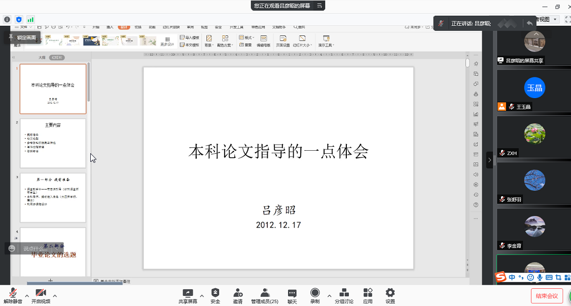 参会老师在分享会中也交流了各自在学生论文指导过程中的困惑和解决办法。此次分享会取得了良好的效果,丰富了全体老师特别是青年教师的论文指导经验,为提升人才培养质量提供了有力保障。