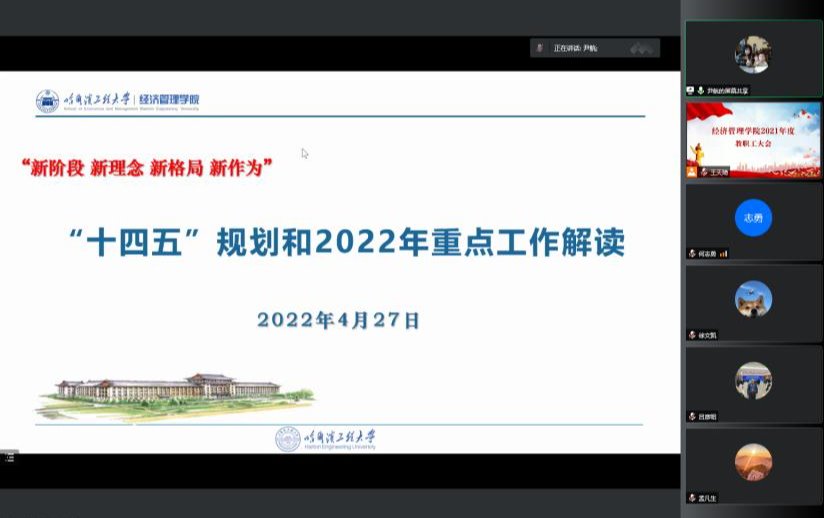 4月27日,学院召开大会,尹航院长作了《经济管理学院十四五规划方案和2022年重点工作解读》报告。