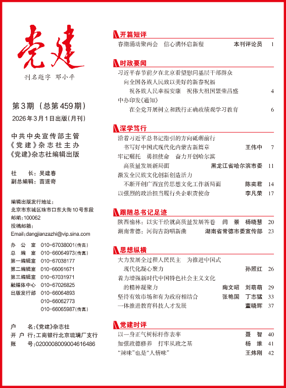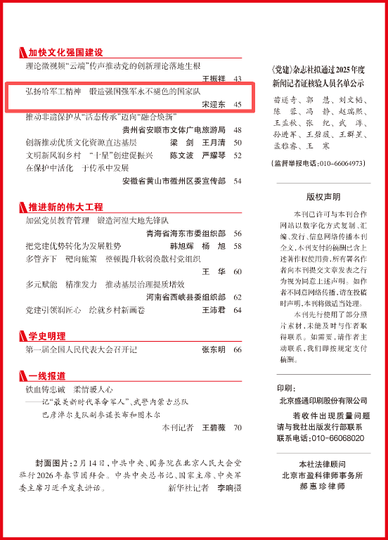 编者按:3月1日出版的2026年第3期《党建》杂志刊发了哈尔滨工程大学党委书记宋迎东署名文章《弘扬哈军工精神 锻造强国强军永不褪色的国家队》。文章指出,哈尔滨工程大学牢记习近平总书记2023年9月视察学校时的殷殷嘱托,坚持守正创新,赓续红色血脉,坚持“三个着力”,聚焦“三个功能”,突出“三个重点”,着力传承好、弘扬好、践行好哈军工精神,努力为强国强军事业作出新贡献。以下为全文。