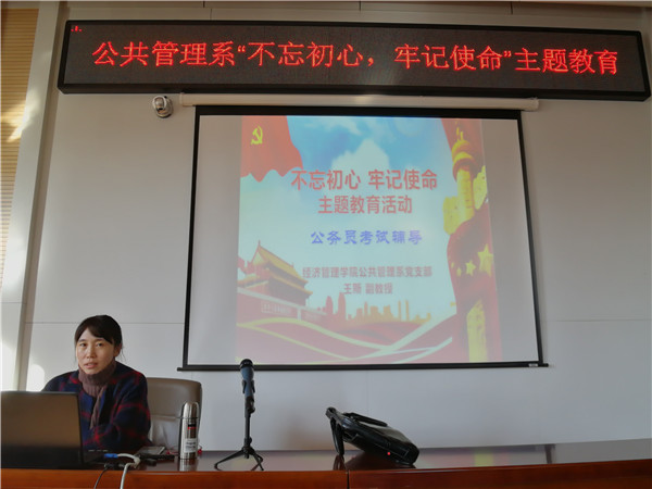 为深入贯彻落实“不忘初心、牢记使命”主题教育,为学生办实事、办好事的要求,经济管理学院公共管理系党支部于2019年11月4日举办“公务员考试辅导”活动,针对公务员考试报名、笔试面试等内容为学生开展专题讲座。公共管理系王斯副教授就“公考是什么、怎么报、考什么、如何备考”等话题,进行了深入浅出的讲解。18级公共管理研究生成乐同学就自己的公考经历与参加讲座的同学们进行了深度互动。