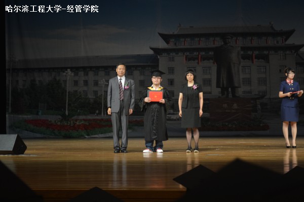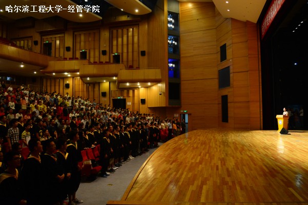 7月2日下午,哈尔滨工程大学经济管理学院2014届本科生毕业典礼暨学位授予仪式在启航剧场隆重举行。哈尔滨工程大学党委副书记、副校长、博士生导师魏潾教授,经济管理学院院长、博士生导师宋艳教授,经济管理学院党委副书记陈岩副研究员,经济管理学院副院长、副博士生导师郭韬副教授,经济管理学院副院长毛锐副研究员,经济管理学院院长助理、博士生导师李晓娣教授以及学院部分教师代表, 全体2014届本科毕业生以及部分学生家长共同见证这一神圣时刻。仪式由经济管理学院学工办主任韩微主持。
