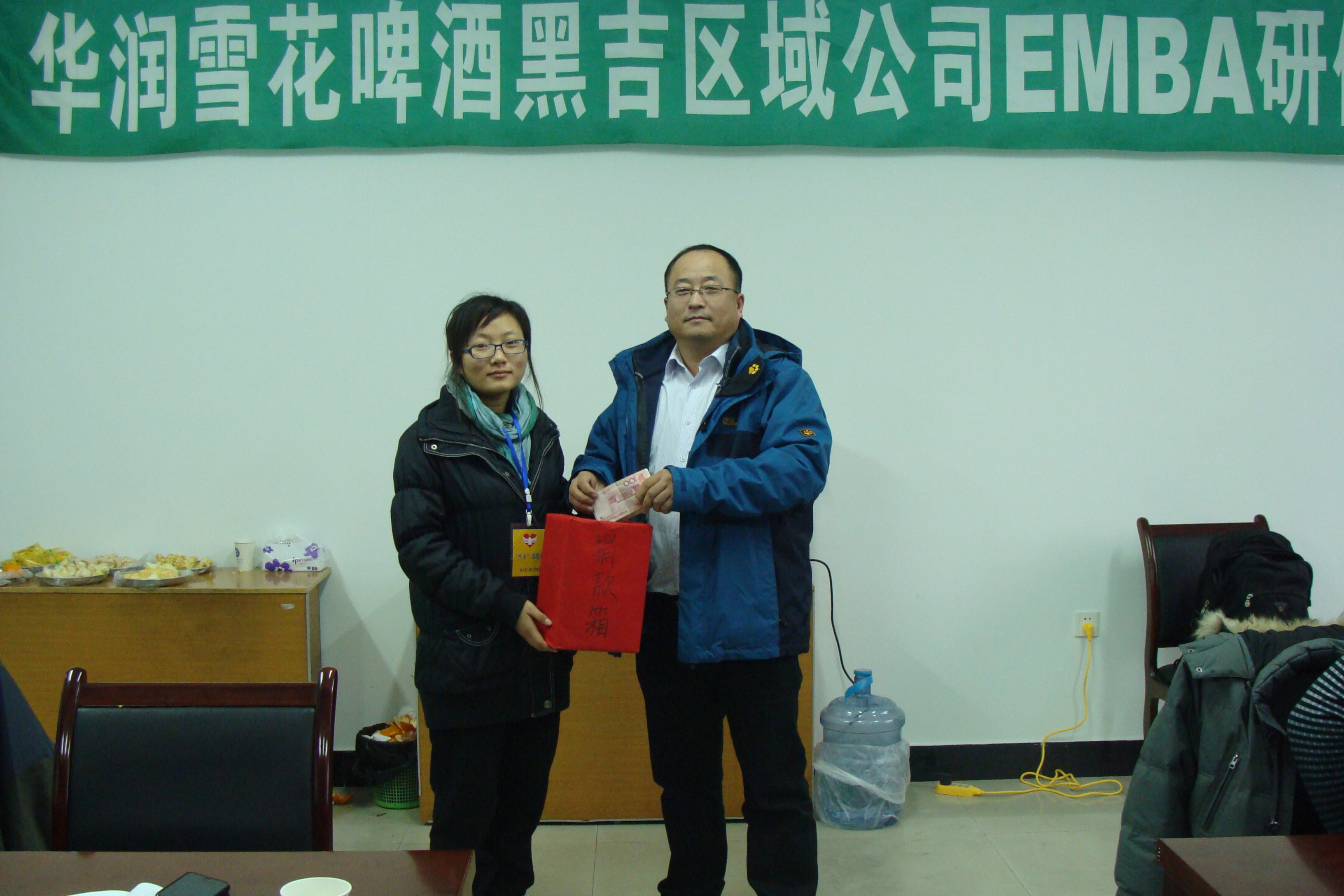 2011年11月25日,华润雪花啤酒黑吉区域公司哈尔滨工程大学经济管理学院EMBA研修班学员自发组织爱心捐款活动,为我校患病学生孙晓祥筹集了3100元爱心捐款。